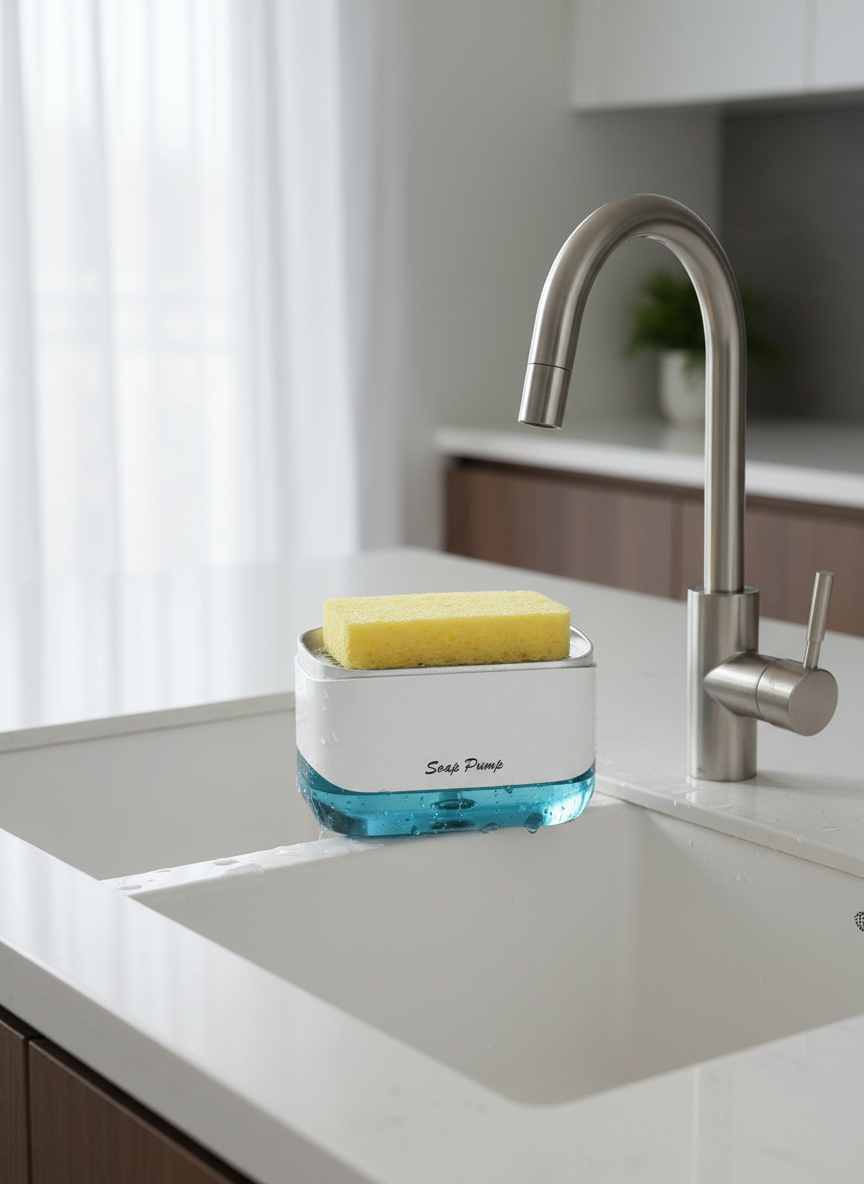 Fast soap press + built-in sponge holder. Keeps your sink clean & organized. π«§