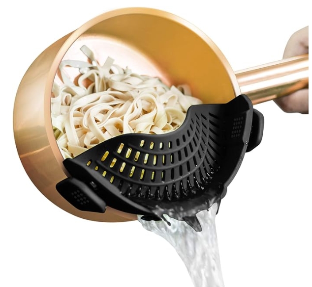 Silicone strainer that clips onto any pot or pan. Fast draining for pasta, veggies and meat β no mess, no extra colander. π₯